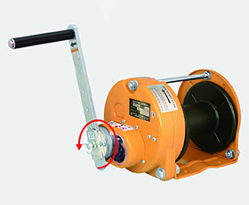 Winding up and down is enabled by right and left reciprocating movements of the ratchet type handle. This winch can be directly installed on walls or floors with narrow spaces where it is impossible to rotate the handle 360 degrees. In addition, this winch can be also used as a rotary winch the same way as the GM series.